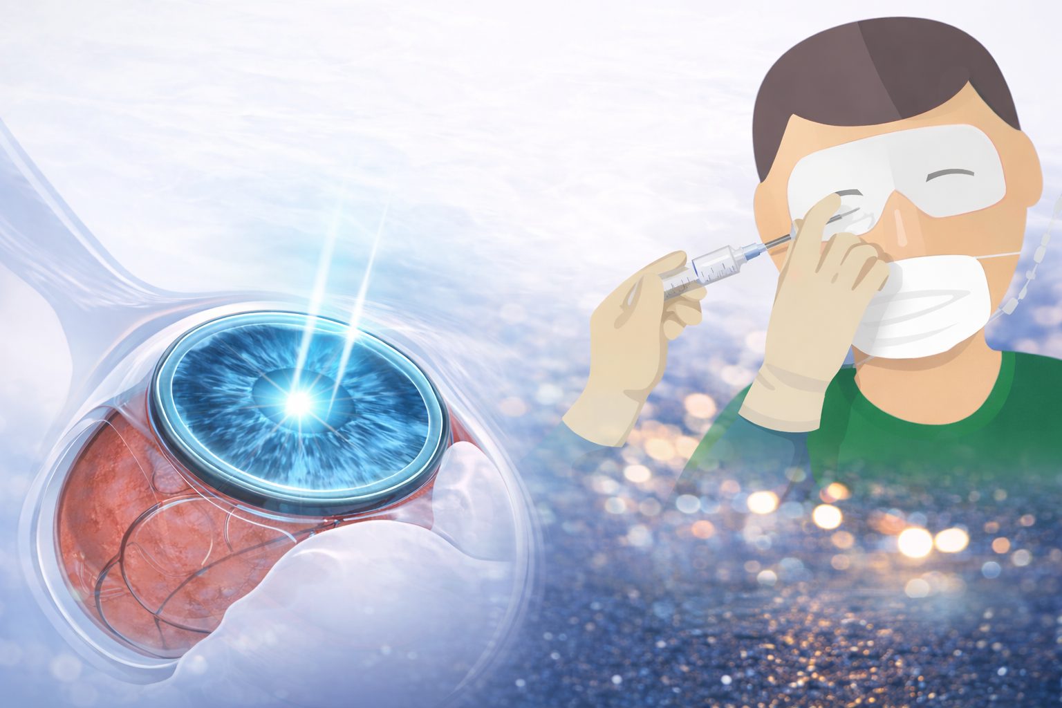 المخدر الموضعي: ويكون على شكل إبرة تؤخذ بجوار العين بحيث يتوقف الإحساس والحركة داخل العين وخارجها